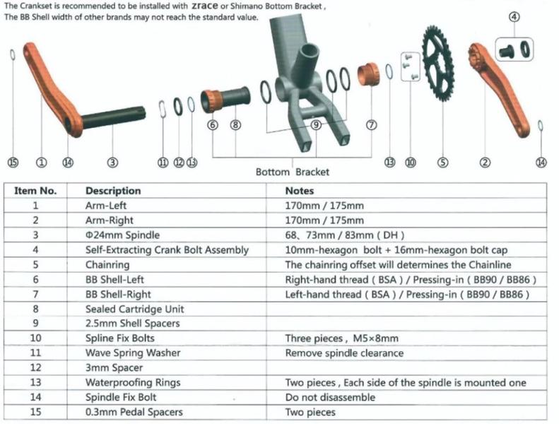 Crank Kit of Zrace, Hardrock Edition 12 speed special edition crank set with 170 or 175 mm pedal arms and BSA Hollotech II bottom bracket system. The crank is CNC milled with a weight of 630 grams, direct mount chainring and 104 mm bolt circle diameter, this is screwed directly onto the crank with 32, 34, 36 or 38 teeth. A weight saving without loss of stiffness and durability for maximum chain guidance, chain tension and reduced chain noise. An optimized tooth arrangement improves the cleaning of the chainring, possible wear and tear is reduced. The bottom bracket is included in the crank kit.