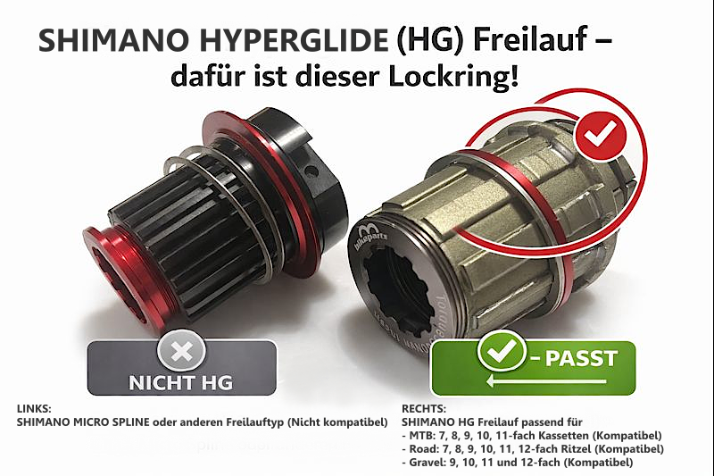 Anello di bloccaggio cassetta 35 mm adatto per cassette SHIMANO, ruota libera. L'anello di bloccaggio è compatibile con cassette a 8, 9, 10 e 11 velocità che hanno un massimo di 11 denti come primo pignone. La coppia di serraggio sul rotore della ruota libera (HYPERGLIDE) è di 35-40 Nm.